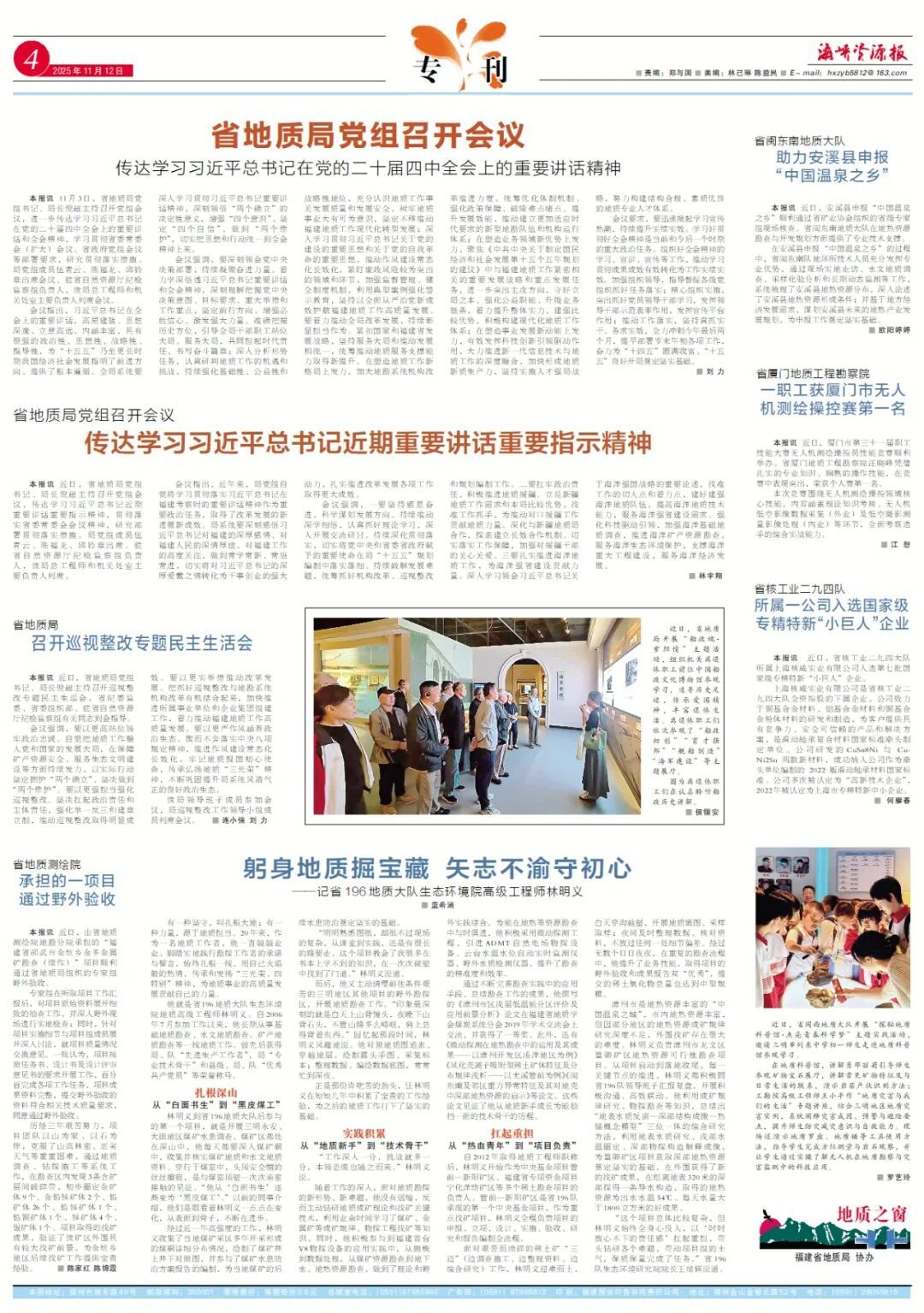 11月12日出版的《海峡资源报》专版报道福建省地质局召开会议传达学习习近平总书记在党的二十届四中全会上的重要讲话精神、召开会议传达学习习近平总书记近期重要讲话重要指示精神、召开巡视整改专题民主生活会,以及局属单位地质工作成果等。