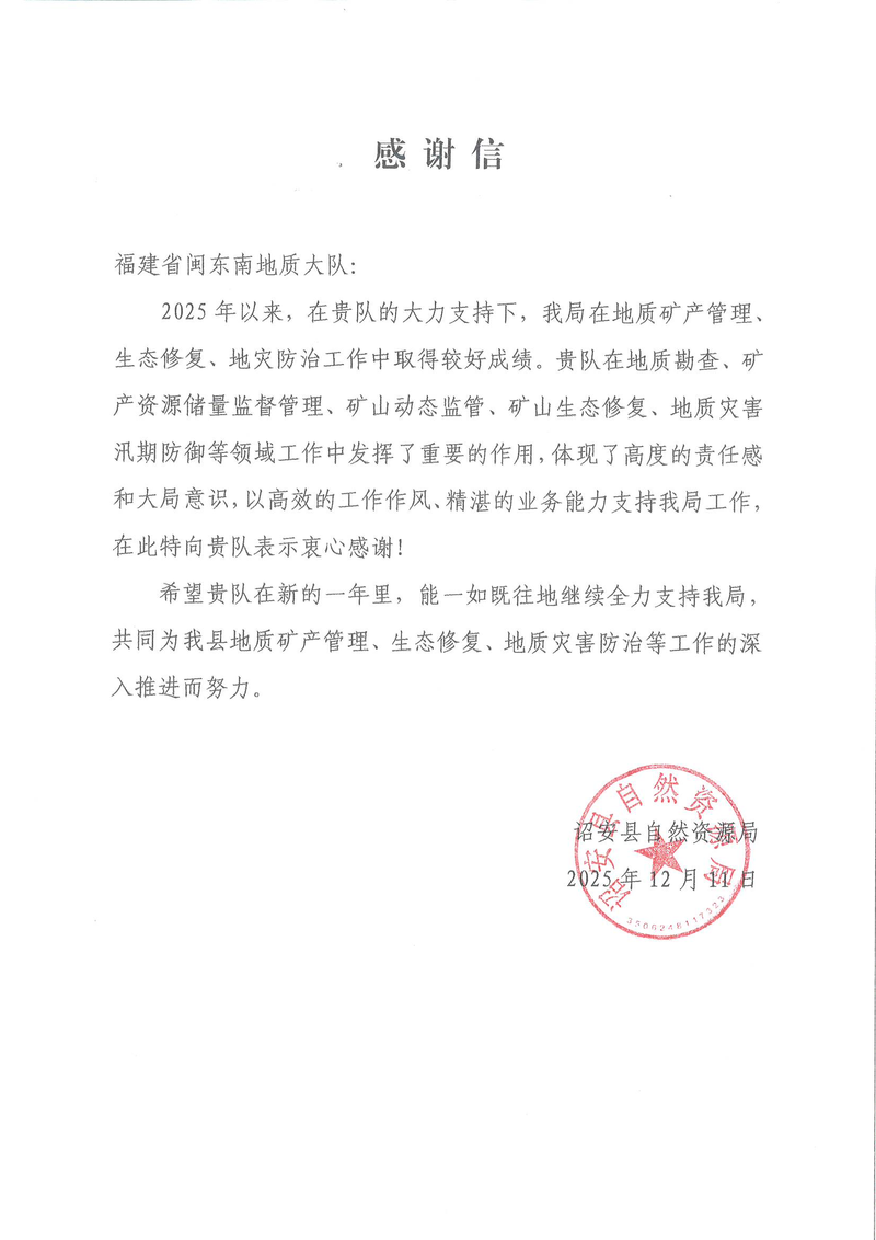 2025年,福建省闽东南地质大队持续为诏安县提供多领域专业地质服务,受到诏安县称赞。诏安县自然资源局近日专门致信感谢。