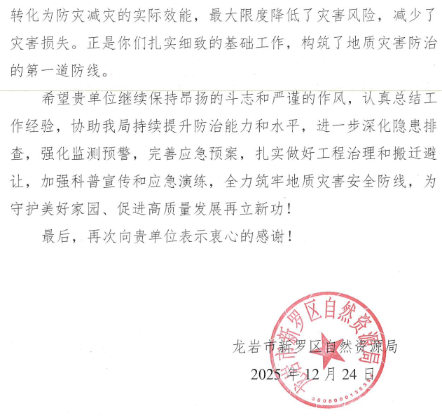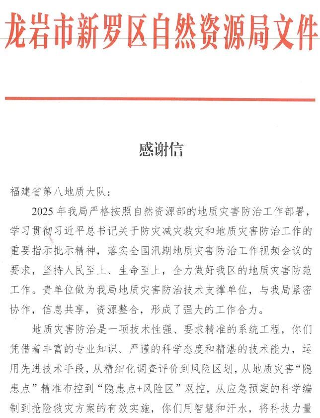 福建省第八地质大队作为龙岩市新罗区地质灾害防治技术支撑单位,为当地地质灾害防范工作贡献地质力量。近日,龙岩市新罗区自然资源局专门致信感谢。