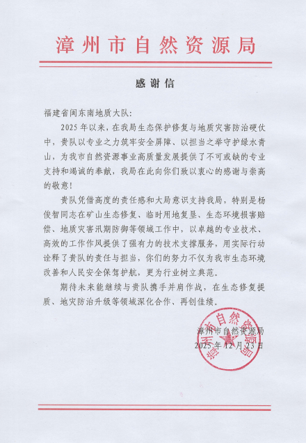 今年以来,福建省闽东南地质大队全力支撑漳州市生态保护修复与地质灾害防治攻坚。近日,漳州市自然资源局专门致信感谢。