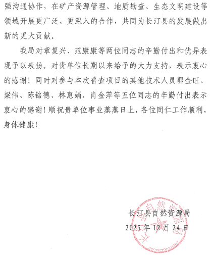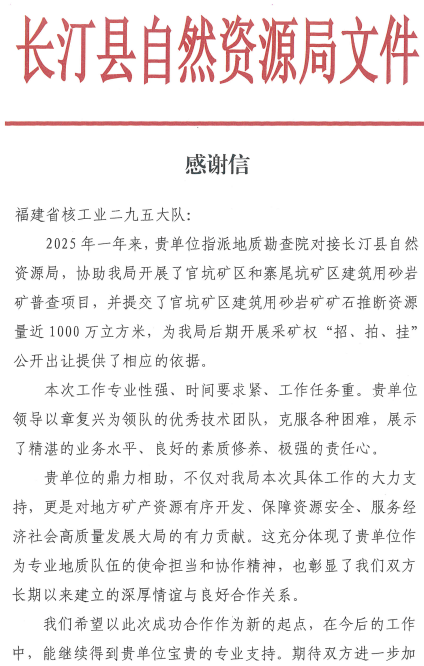 2025年,福建省核工业二九五大队持续为长汀县提供专业技术支撑服务,并取得一系列成果。近日,长汀县自然资源局专门致信感谢。