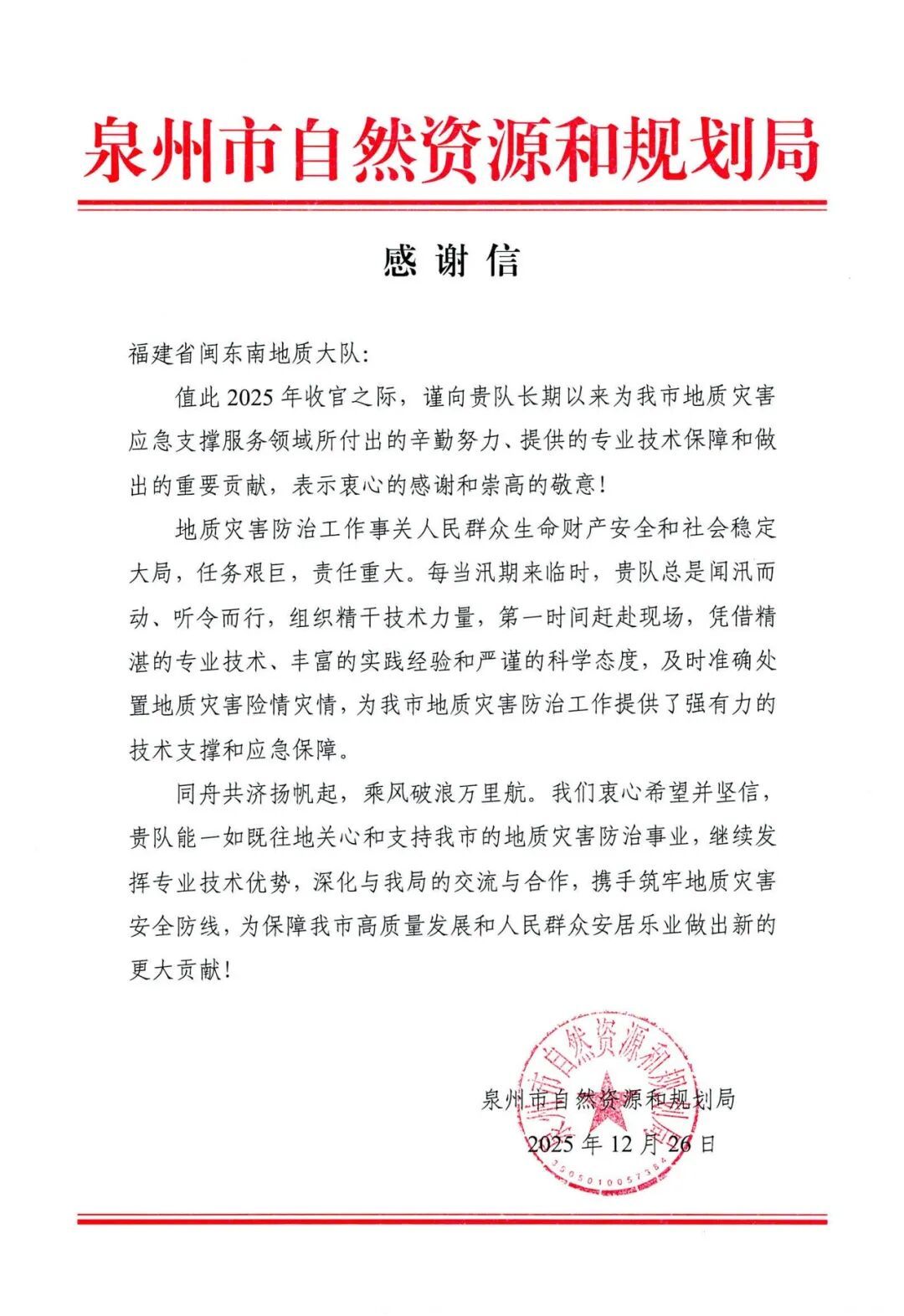 2025年,福建省闽东南大队积极为泉州市提供地质灾害防治技术支撑服务。近日,泉州市自然资源和规划局专门致信感谢。