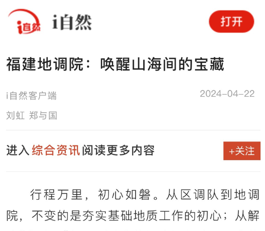 4月19日,福建自然资源微信公众号刊发《地质足迹印山川|看省地质调查研究院如何唤醒山海间的宝藏》。