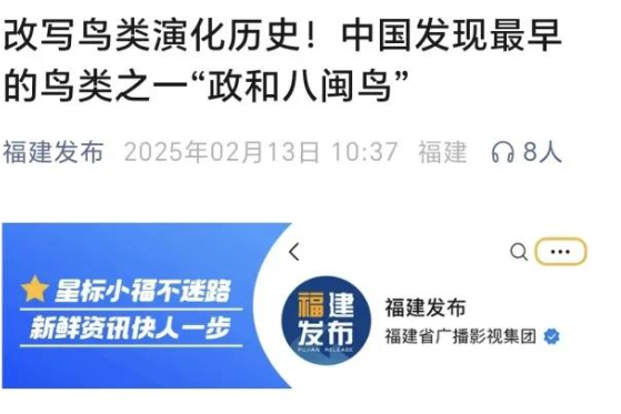 2月13日,福建发布公众号发布《改写鸟类演化历史!中国发现最早的鸟类之一“政和八闽鸟”》,报道福建省人民政府新闻办公室召开“政和八闽鸟”化石重大发现科研成果新闻发布会,发布由中国科学院古脊椎动物与古人类研究所和省地质调查研究院合作完成的政和动物群发现侏罗纪鸟类化石“政和八闽鸟”的研究成果。