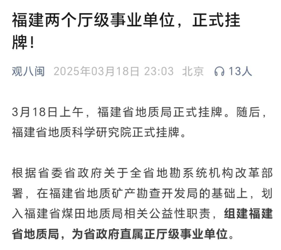 3月18日,人民网观八闽公众号刊发《福建两个厅级事业单位,正式挂牌!》新闻,报道福建省地质局、福建省地质科学研究院正式挂牌。